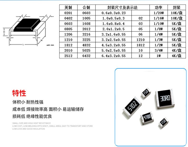 貼片電阻有5種參數(shù)、即尺寸、阻值、允差、溫度系數(shù)及包裝。